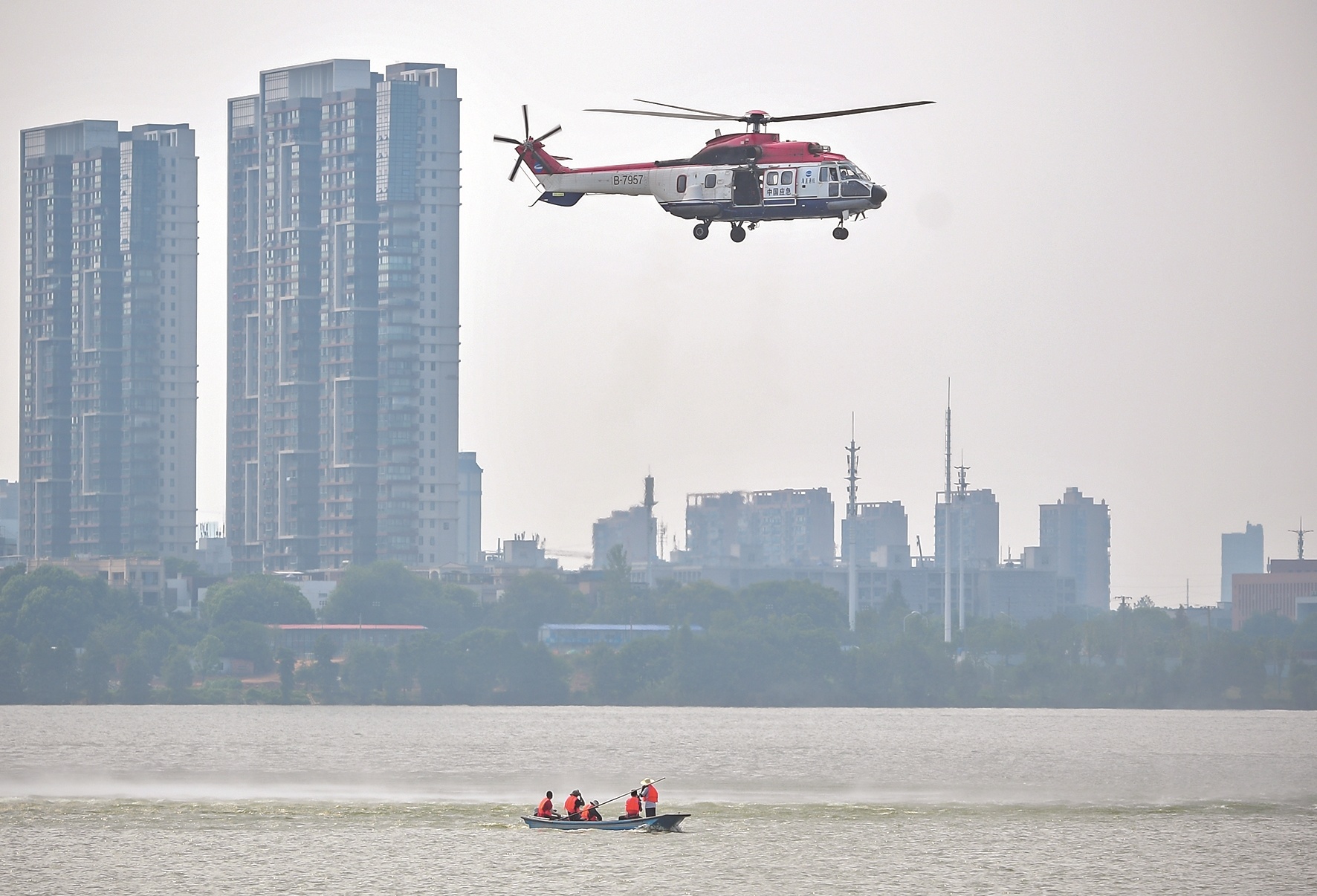 8月3日下午2时整,一架AS332L1型直升机(绰号“超级美洲豹”)从湖北省自然灾害工程应急救援基地起飞,10分钟后悬停在武汉黄家湖上空。尽管距离水面30多米高,但巨大的飞机旋翼却在水面上扇起了“七级旋风”。