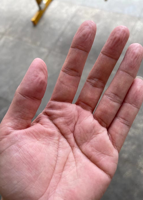 武汉科技大学附属天佑医院的一位医护人员手掌已被汗水浸皱