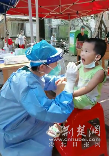 武汉市中心医院医护蹲下来为一个小朋友做核酸检测