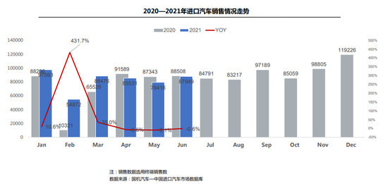 流通协会分析称,乘用车消费升级仍然是增长的核心动力,进口市场豪华车走势表现良好。但受芯片短缺以及此前平行进口暂停等因素影响,6月当月,进口乘用车终端销售8.8万辆,同比轻微下滑0.6%。