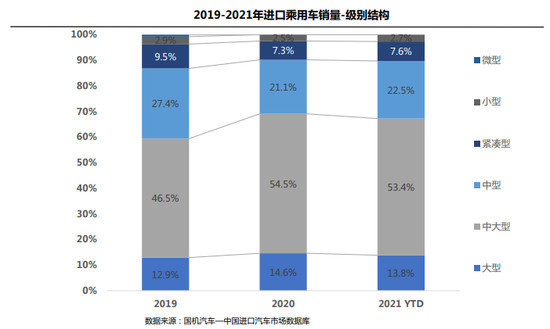 从车型结构看,1-6月,受平行进口暂停影响,大型车和中大型车份额分别下滑0.8%和1.1%。中型、紧凑型、小型车份额均有所提升。其中,中型进口车细分市场份额同比继续提高1.4%,紧凑型和小型进口汽车份额分别回升0.3%和0.2%。
