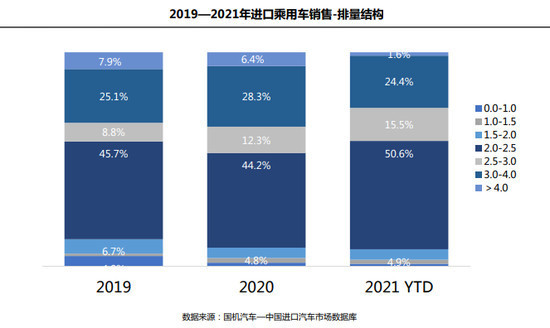 排量方面,2.0-2.5L仍然占据上半年进口车销售第一排量区间,销售份额为50.6%,同比提升6.4%;同样受限于平行进口暂停因素,3.0L以上车型份额明显下降,3.0-4.0L和4.0L以上车型分别占24.4%和1.6%的市场份额。流通协会认为,进口汽车总体向小排量倾斜,有利于降低进口车油耗,进而满足油耗法规、降低关税。