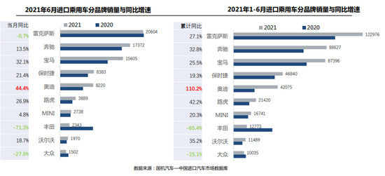 从具体品牌来看,1-6月,雷克萨斯销量依然遥遥领先,蝉联进口品牌榜首,奔驰超越宝马位居第二;丰田受平行进口暂停影响,销量大幅下滑。6月,进口乘用车前十品牌中七成同比增长。其中,奥迪仍保持44.4%的最大增幅;受ES销量下滑和LX换代影响,雷克萨斯同比下滑0.7%;丰田下滑幅度最大,达71.3%。