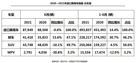 1-6月,进口乘用车销售车型中轿车和SUV车型占比高达96.8%,同比分别增长30.7%和4.5%,MPV车型同比下滑12.0%。6月,除轿车同比增长15.6%外,SUV和MPV销量均下滑,下滑幅度分别为10.1%和30.8%。