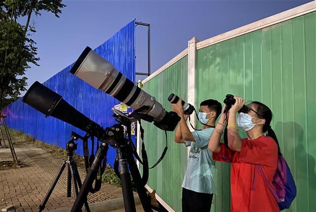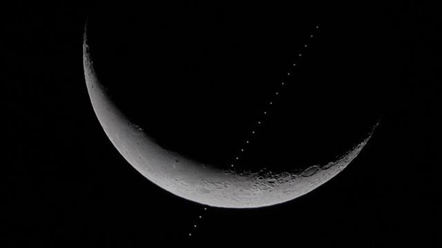 2021年8月5日凌晨5时5分,在武汉市黄陂区拍摄到的中国空间站凌月。中国空间站天和核心舱在距离地球400千米的高空中快速飞行,90分钟就可以绕地球一圈。理论上,在它飞行轨迹的下方区域,人们仰望天空能看见它的机会很多,但其实多数情况下它是不容易被看到的。在400千米的距离上,肉眼能看到的中国空间站天和核心舱就是一个小点,白天几乎完全看不到,只有在“凌日”(中国空间站从太阳面上飞过)的时候才能用专业的设备观测和拍摄到。到了晚上,由于空间站会反射阳光,所以在夜空中它就会比较亮,容易观测到。比较好的时段是在太阳落山后的1—3个小时和日出前的1—3个小时,中国空间站在夜空中就像一颗慢慢移动的“星星”。只要天气晴好,市民使用微信小程序“天文通”查询过境时间,在预报的时间内抬头仰望夜空,就可以肉眼看到中国空间站飞过。