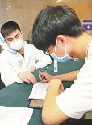 汉口站驻守人员教张万填写个人信息申报表。硚口区专班工作人员将重点地区来汉人员信息传给相关社区。