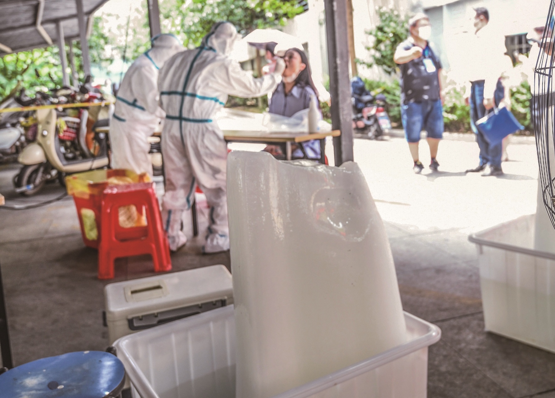 烈日炎炎。5日下午,在北湖街道建设社区,每位医护人员的脚边都摆放着一个“巨无霸”冰块。该社区有3500多位居民,截至中午,仅剩约100位居民还没做核酸检测。