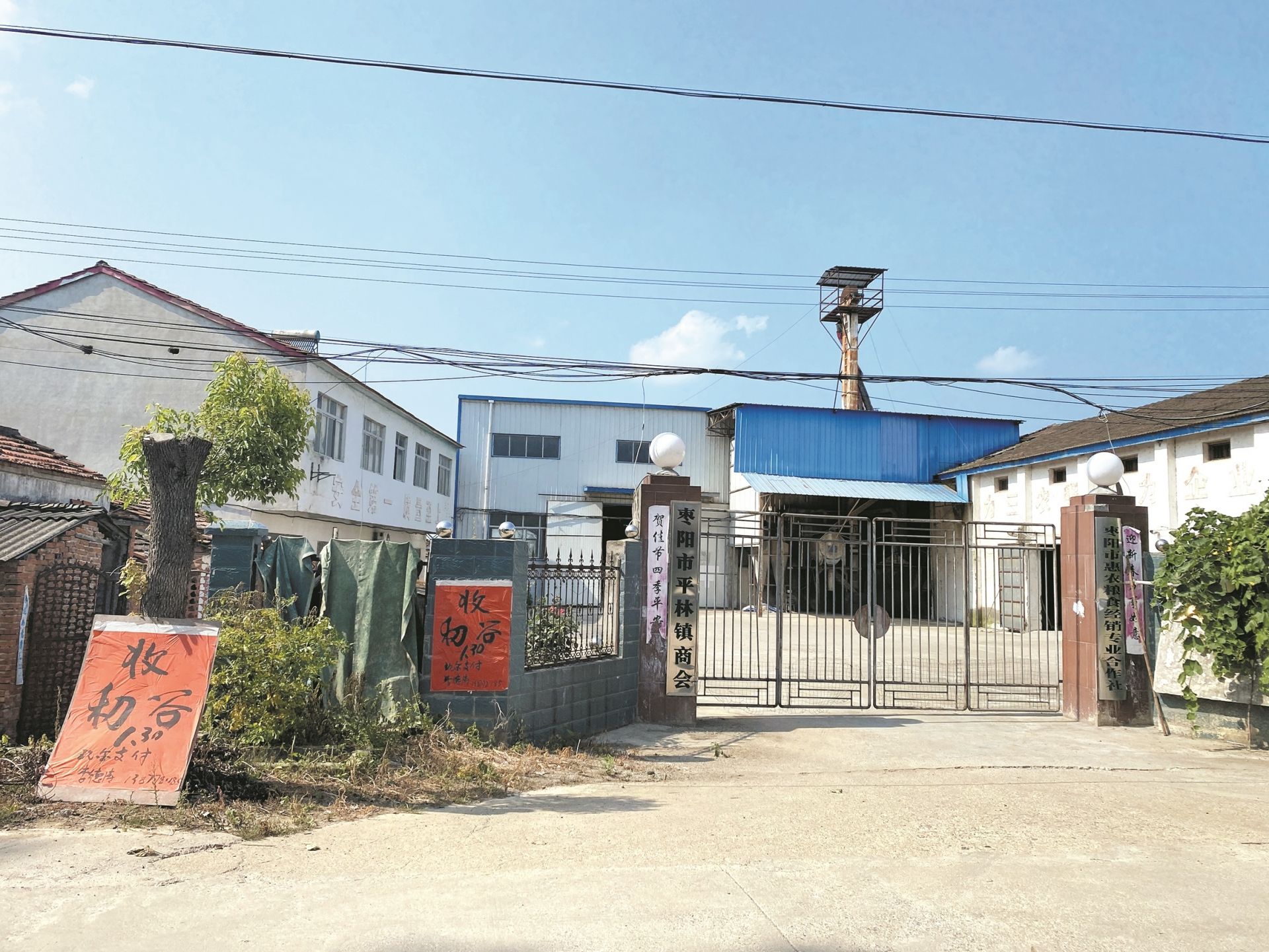 7月29日中午,烈日似火。枣阳平林镇平林村公路边的天炀米业公司大厂房前树阴下,聚集了几十位村民。挂有“天炀精米”招牌的厂房铁门紧锁,门口红纸上写着:收稻谷,1.3元,现金支付。