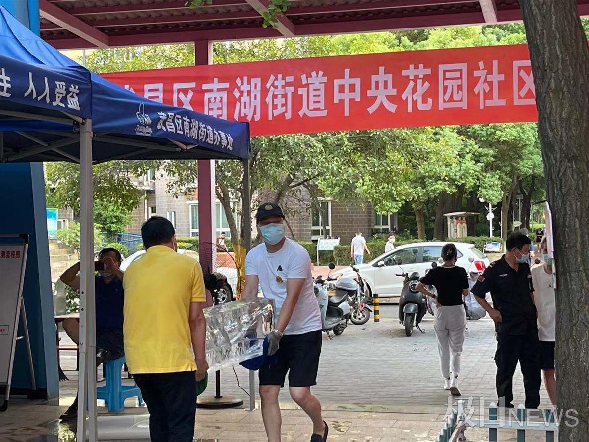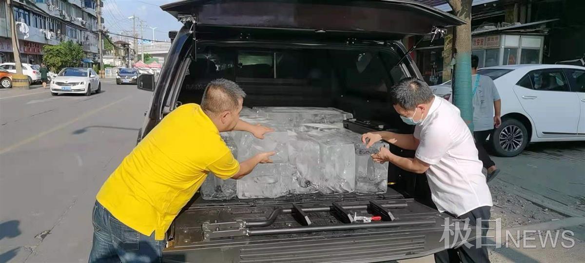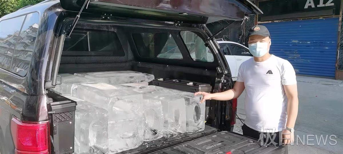 当天16时至20时,整整4个小时,许方辉开着自己的皮卡车,和双闪队员们紧急驰上街头,取冰、装车、奔赴急需冰块的核酸检测社区,把一个一个的巨无霸冰块送到了武昌南湖街道中央花园社区等最急需降温的地方。