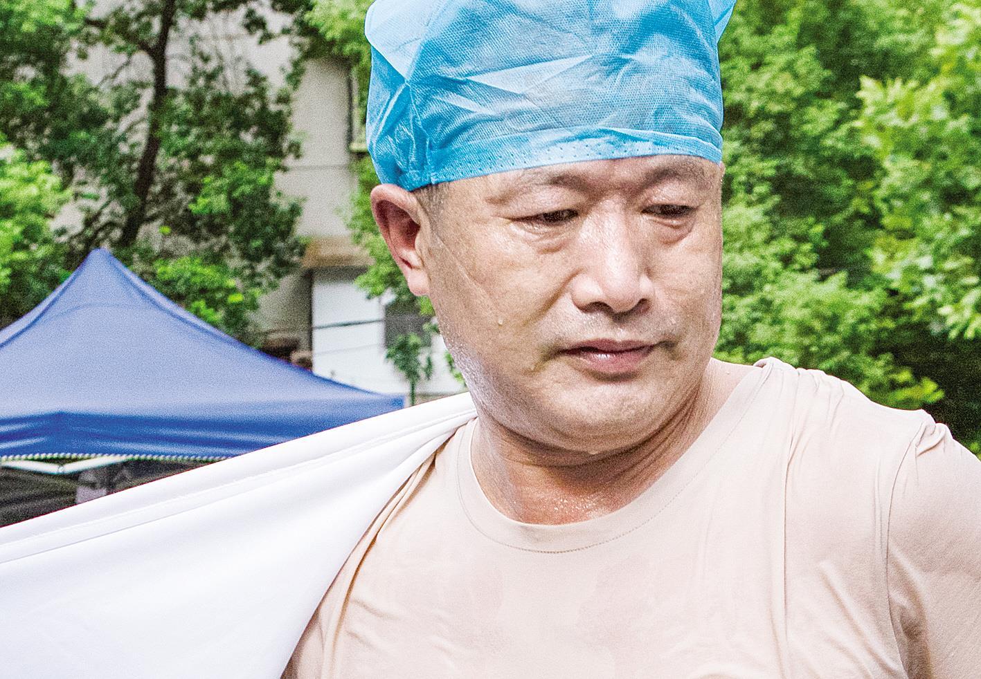 8月5日,武汉市江汉区汉兴街杨汊湖社区核酸检测点,社区卫生服务中心医生杨军娇给居民做完核酸检测后,全身湿透。