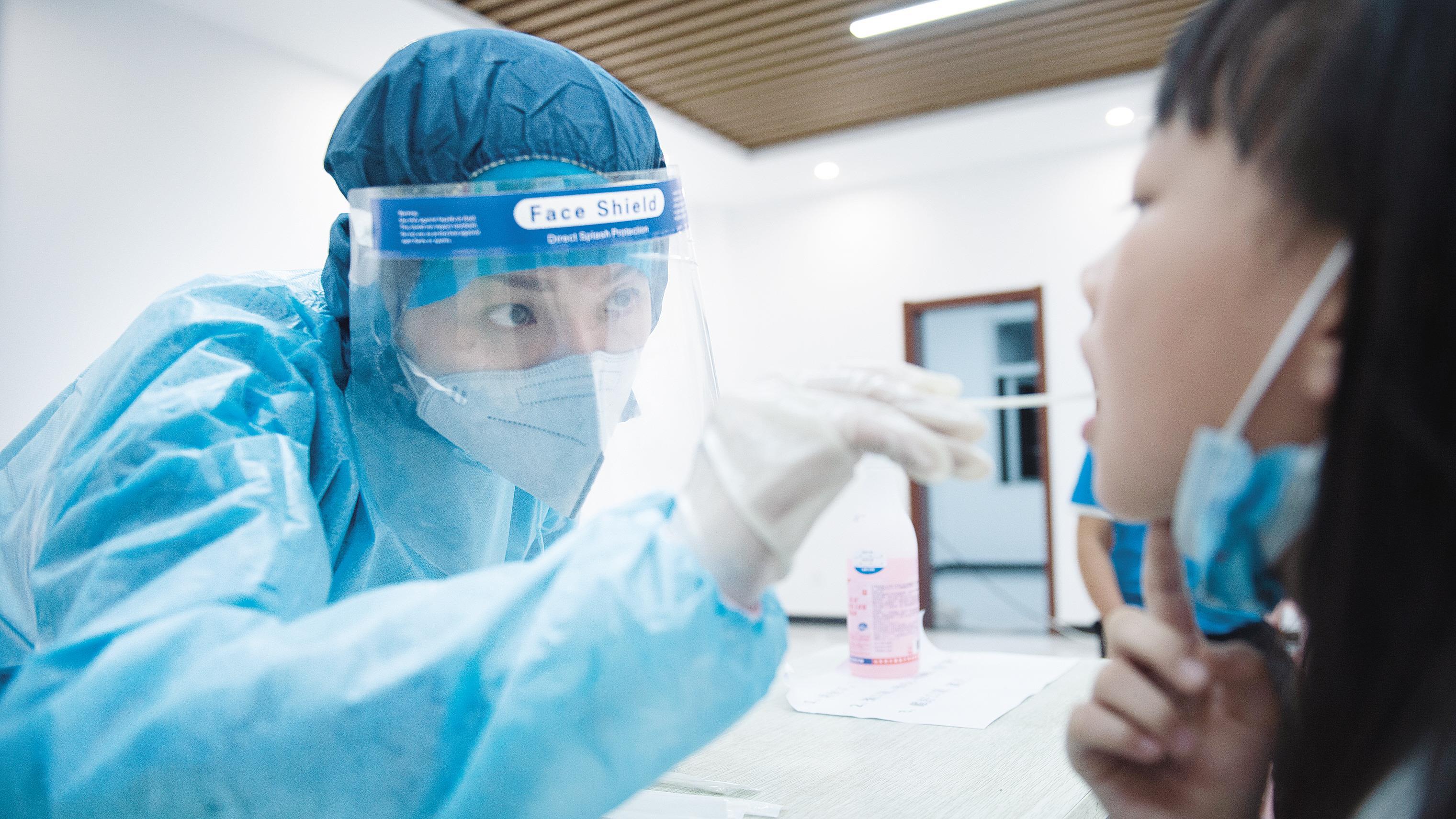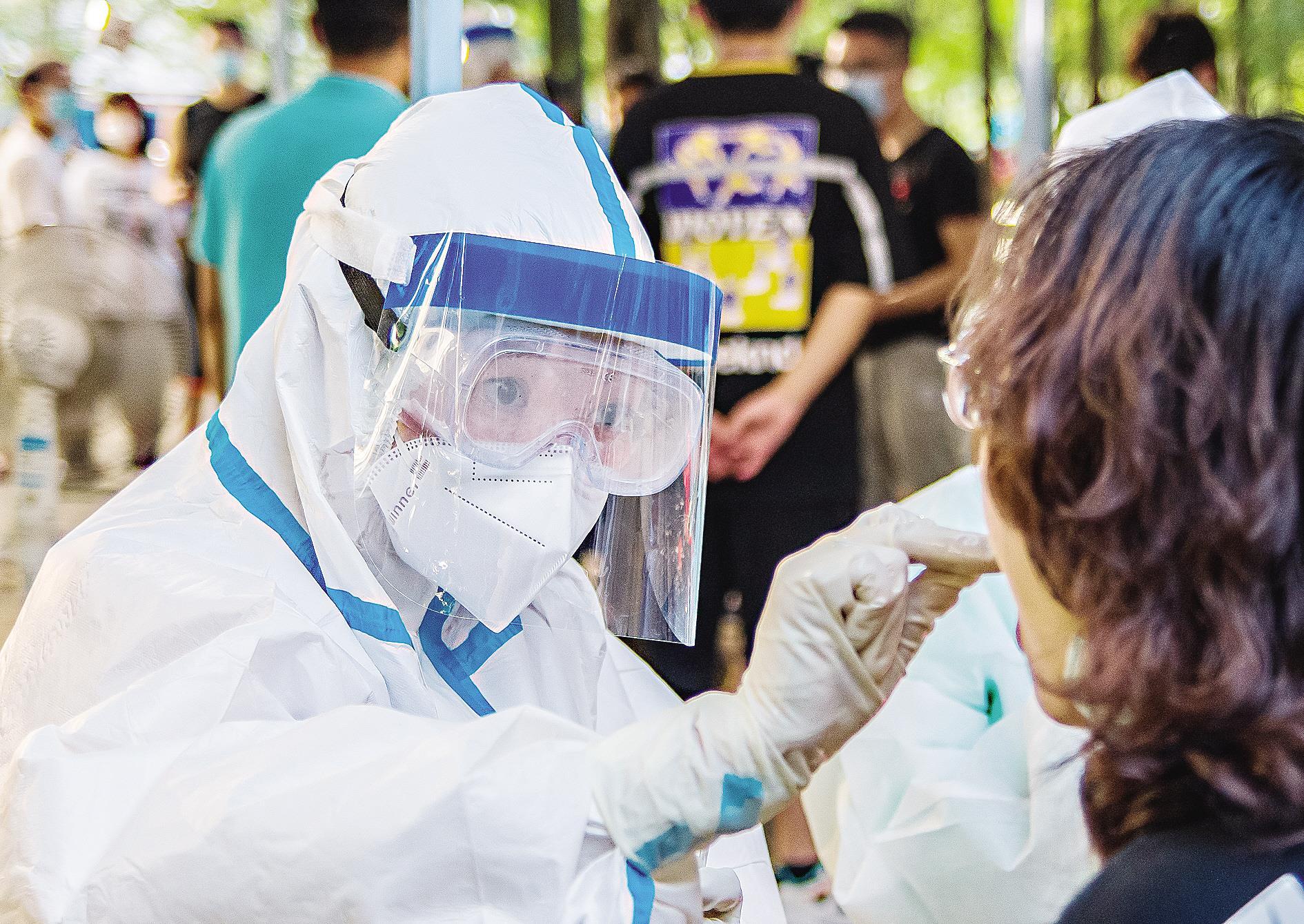 8月4日,华中农业大学,一名医护人员正在全神贯注地给大学生进行咽拭子采集。