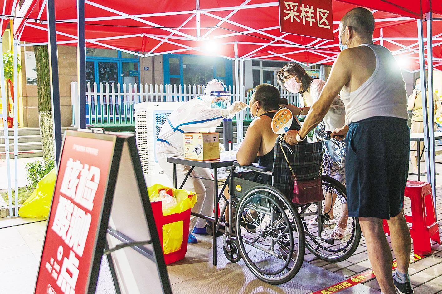 8月3日,武汉全面启动全员核酸检测,当晚在武汉市青山区红钢城街道三街社区核酸检测点,红钢城街社区卫生服务中心的医务人员为社区群众进行检测。