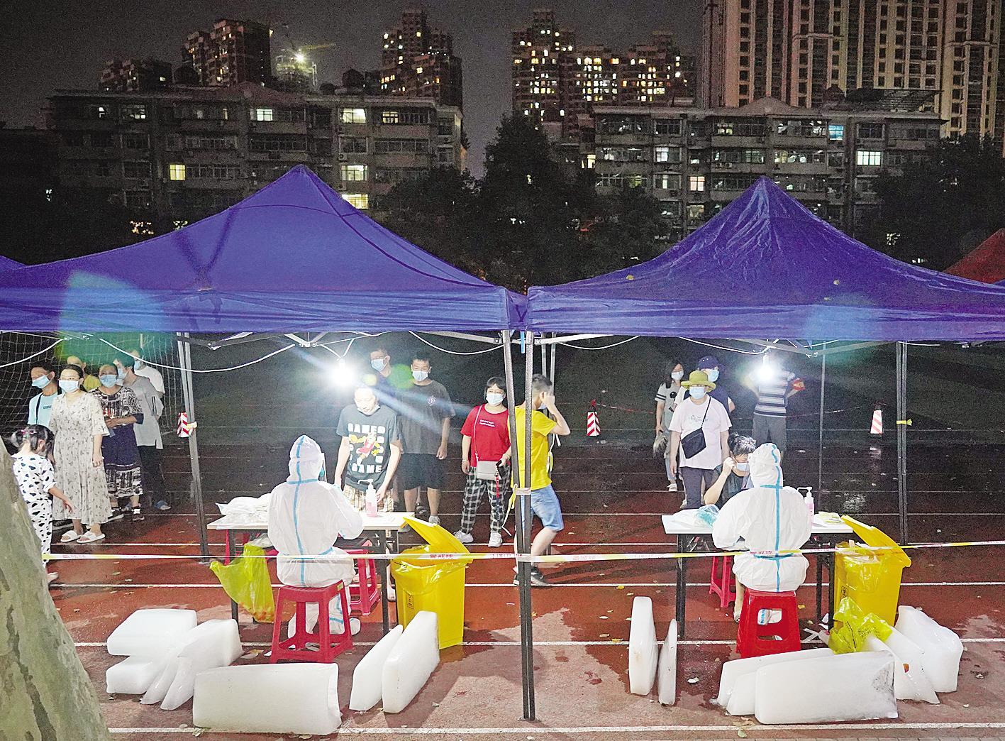 8月4日晚9时许,武汉大学医学部操场,武汉大学中南医院医务人员在做核酸检测,旁边摆放的是企业商家捐赠的冰块。