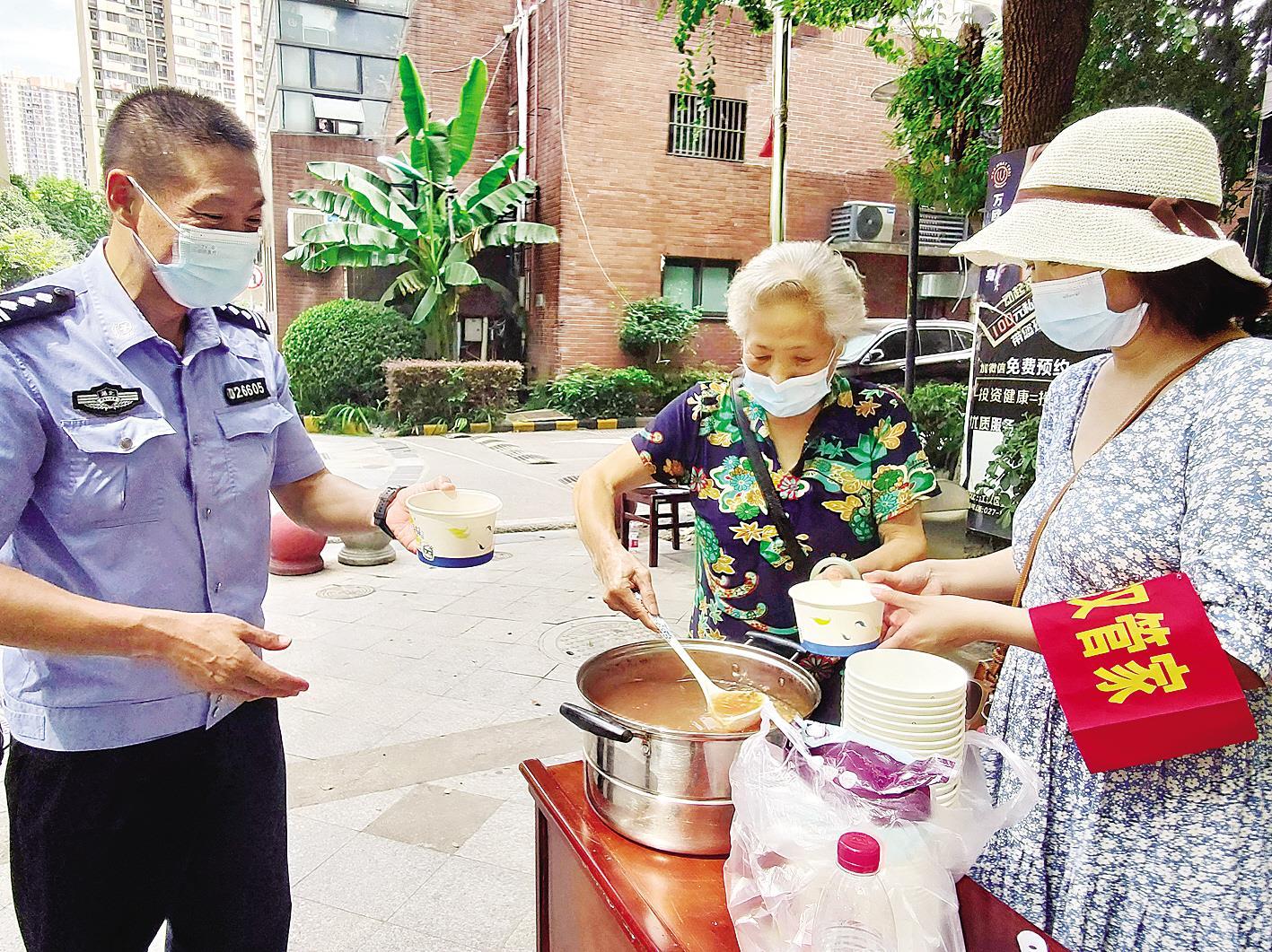 8月5日,唐家墩街汽运社区72岁居民汪腊荣(中),在家煮了绿豆汤,慰问医务人员、社区工作者、下沉党员等工作人员。