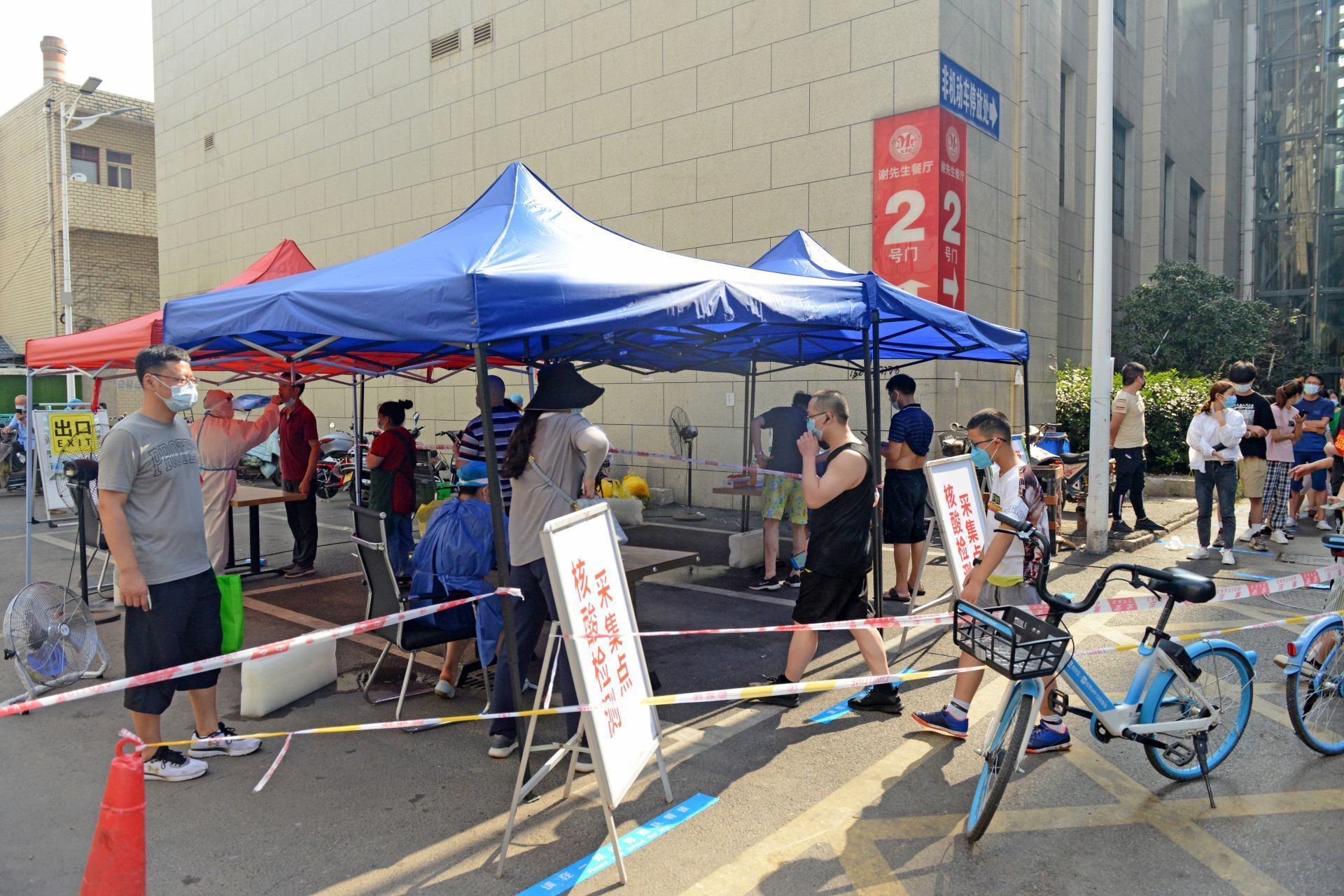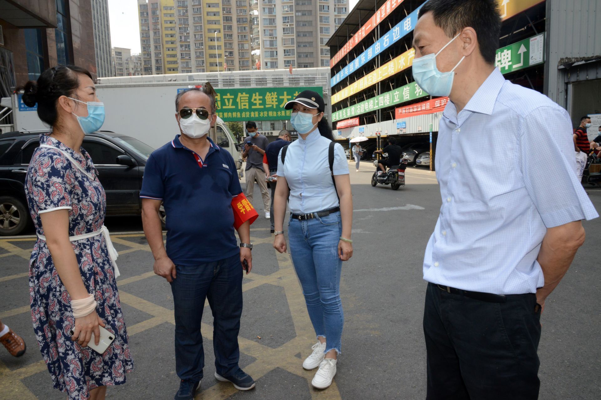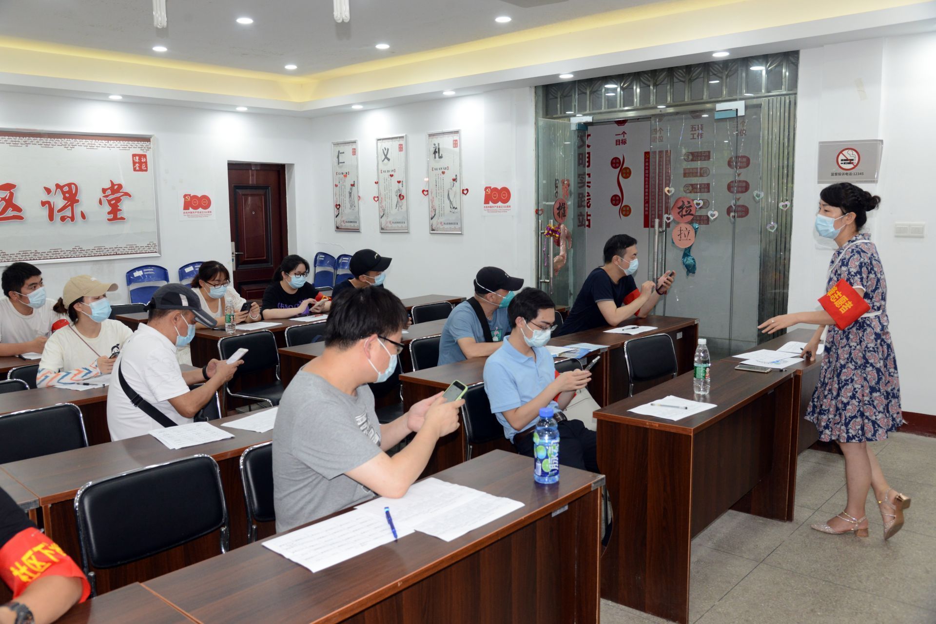 “这位外卖小哥,请扫码测温并进行信息登记。”面对外来人员,程广、李莉、彭昭婧严格按照疫情防控标准,进行信息登记并查看其大数据行程码。余刚、杨卫东、李杰边一边维持现场秩序一边叫号。烈日之下,汗水连连,大家却依然坚持。