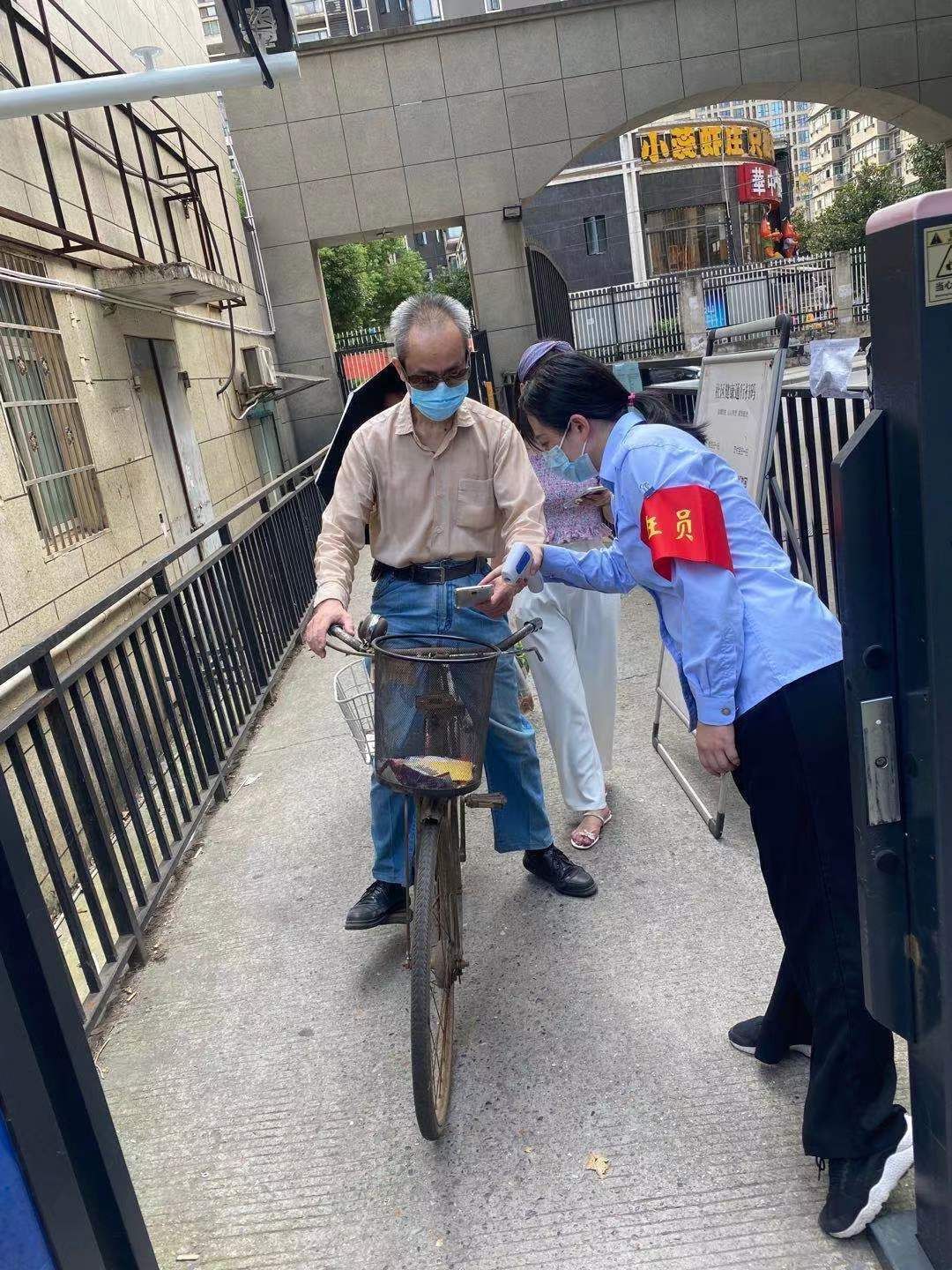 范恒瑞、林永翔带上红袖章,带好测温枪,支援南门门岗,对每一位出入居民进行扫码测温,并按照新四必要求提醒居民佩好口罩。周琍率领着“宣传队”流动宣传,引导群众保持一米间距、全程戴好口罩、减少交谈、严守秩序。