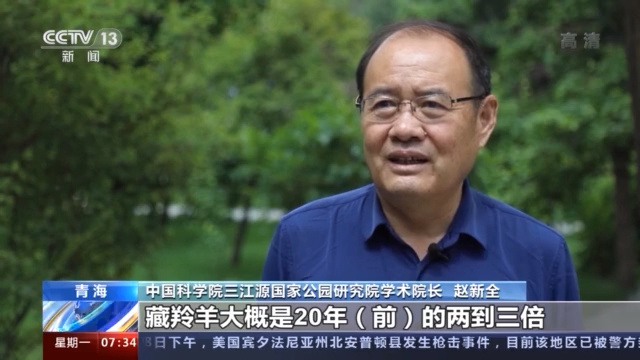 中国科学院三江源国家公园研究院学术院长 赵新全:植被的生产力在增加,如果和2000年相比的话,大约增加30%。第二个方面就体现在生物多样性在急剧恢复,包括这个明星物种的数量藏羚羊大概是20年(前)的2到3倍,藏野驴、野牦牛,包括白唇鹿的数量其实也在这样一个增长量级上。