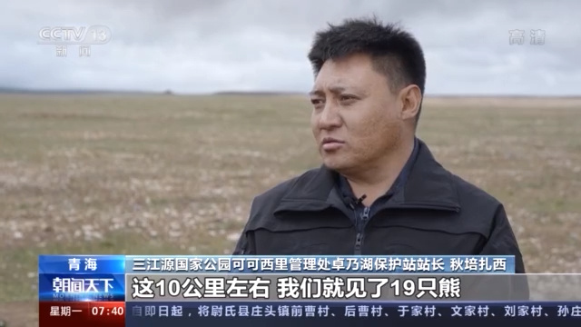 三江源国家公园可可西里管理处卓乃湖保护站站长 秋培扎西:我们去巡护的时候,走了10多公里的路程,就见19只棕熊,有母熊带着小熊的,也有成年熊一起搭伴儿的,很少在其他地方能见到这种情况,藏羚羊产崽的季节,全部都集结在卓乃湖产崽地,对它的天敌来说,就是饕餮盛宴。