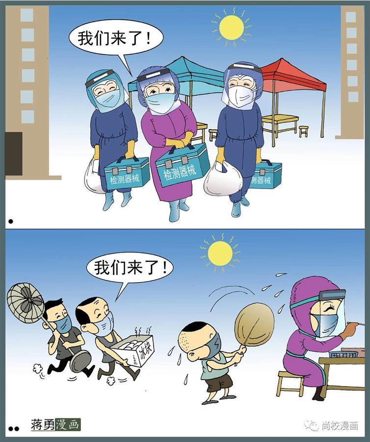 “我们来了”,漫画上,几位医护人员身穿防护服、戴着口罩,提着检测器械奔赴抗疫一线开展核酸检测,画中场景十分生动。连日来,武汉的漫画家以漫画作枪,记录武汉开展全员核酸检测。