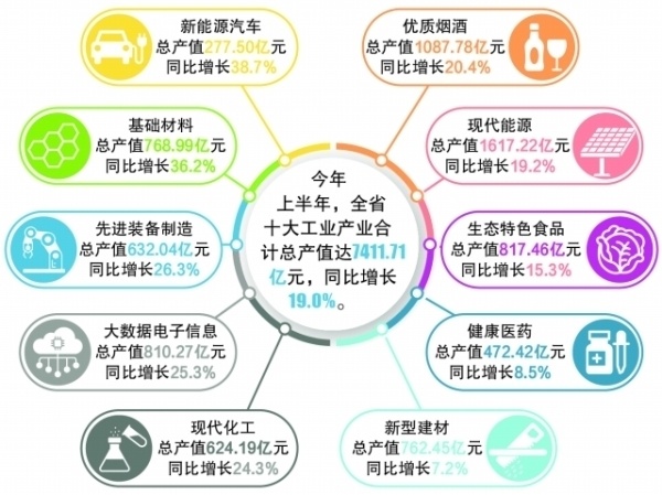 统计显示,今年上半年,我省十大工业产业中,现代能源总产值为1617.22亿元、优质烟酒总产值为1087.78亿元、生态特色食品总产值为817.46亿元、大数据电子信息总产值为810.27亿元、基础材料总产值为768.99亿元、新型建材总产值为762.45亿元、先进装备制造总产值为632.04亿元、现代化工总产值为624.19亿元、健康医药总产值为472.42亿元、新能源汽车总产值为277.50亿元。