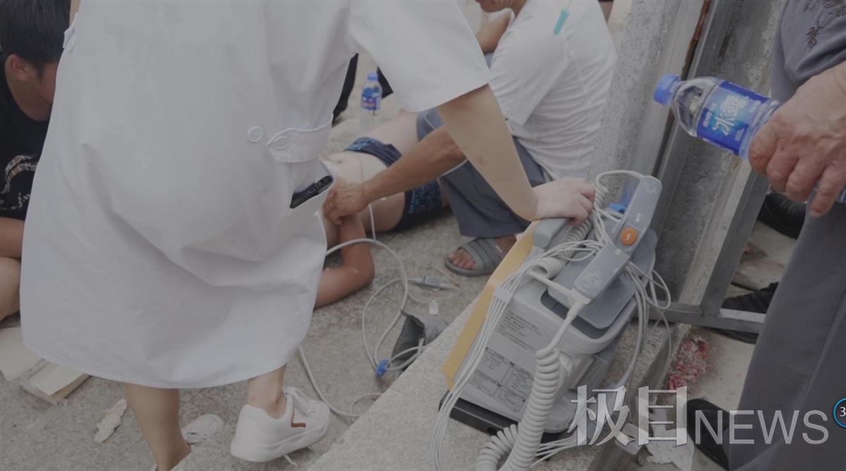 现场图片显示,水塘边整齐摆放着鞋子、裤子、手机等随身物品,一男孩躺在地上,医护人员正在现场抢救。