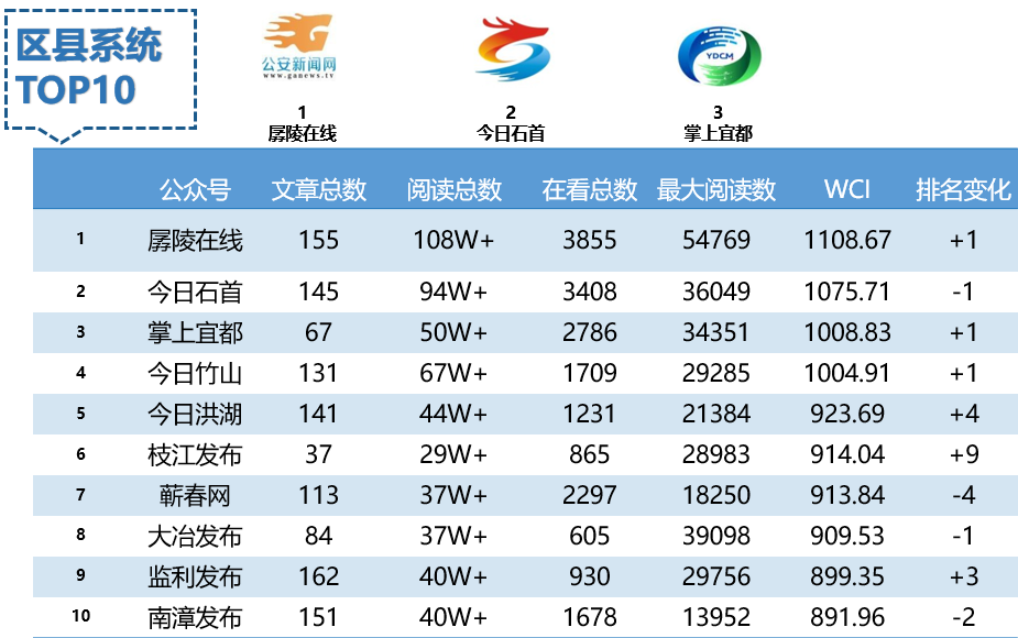 从具体排名来看,本期榜单变动不大,“掌上宜都”进入前三甲,“今日洪湖”成功入列Top5排名;“枝江发布”表现出众上升9位,再次入榜,位列第6名。“监利发布”上升3位,“蕲春网”“南漳发布”分别下降4位和2位;其余各家单位排名均为上下1名的小幅度波动。