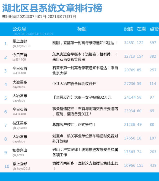 从原创文章排行榜来看,“掌上宜都”的《刚刚,宜都第一封高考录取通知书送达!》排第一。“今日石首”携3篇原创文章强势入围,其中两篇排第二、第三,分别是《东京奥运会平衡木(资格赛)暂列第一!来自石首女孩管晨辰》《石首市第一封高考录取通知书送达!来自北京大学》。“大冶发布”同样携3篇原创文章入围,其中两篇分别排第四、第五,分别为《中共大冶市委全体会议召开》《【全民反诈】大冶一女子被骗32万元》。