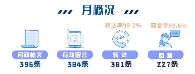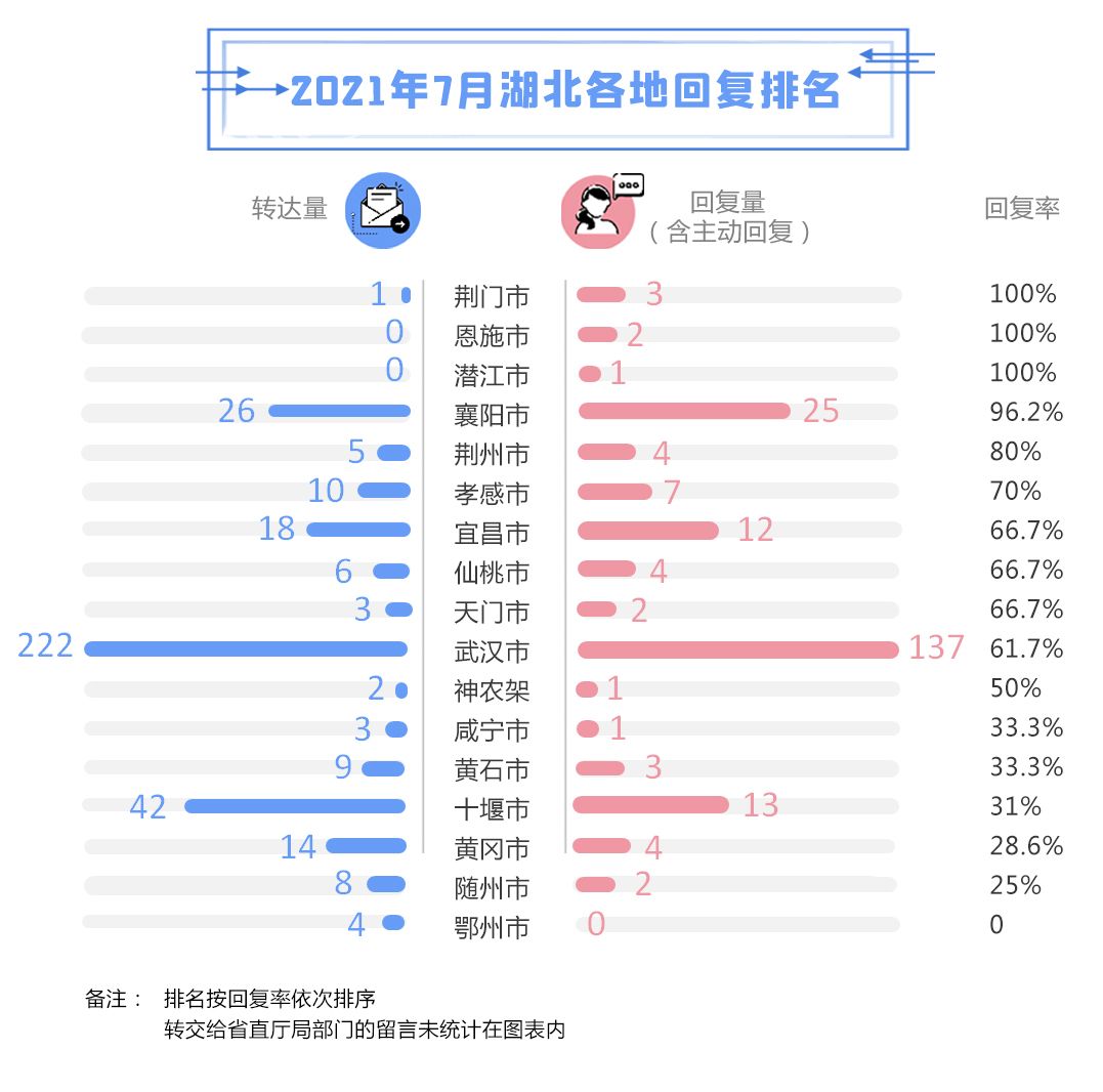 荆楚网(湖北日报网)讯(记者 刘文颖 设计 王昌羿)2021年7月,荆楚网(湖北日报网)《民生热线》《荆楚问政》两大网络问政平台共收到396条网友留言,有效留言384条,其中227条留言得到相关部门回复,已有96个政府部门认领了《荆楚问政》平台账号,《民生热线》共有2743家单位实名入驻。