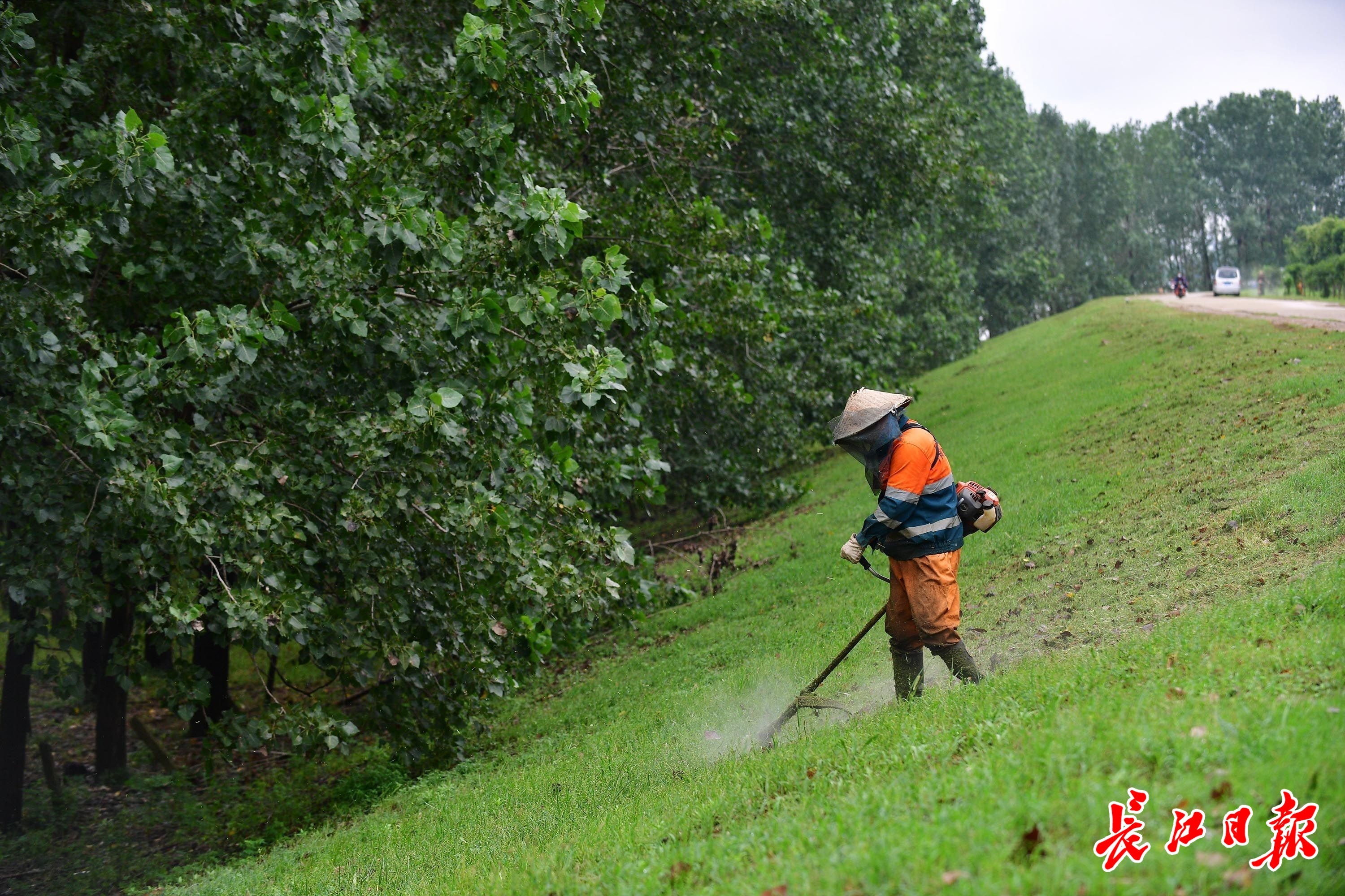 工人用打草机清理堤坡上的杂草,以便险情排查。