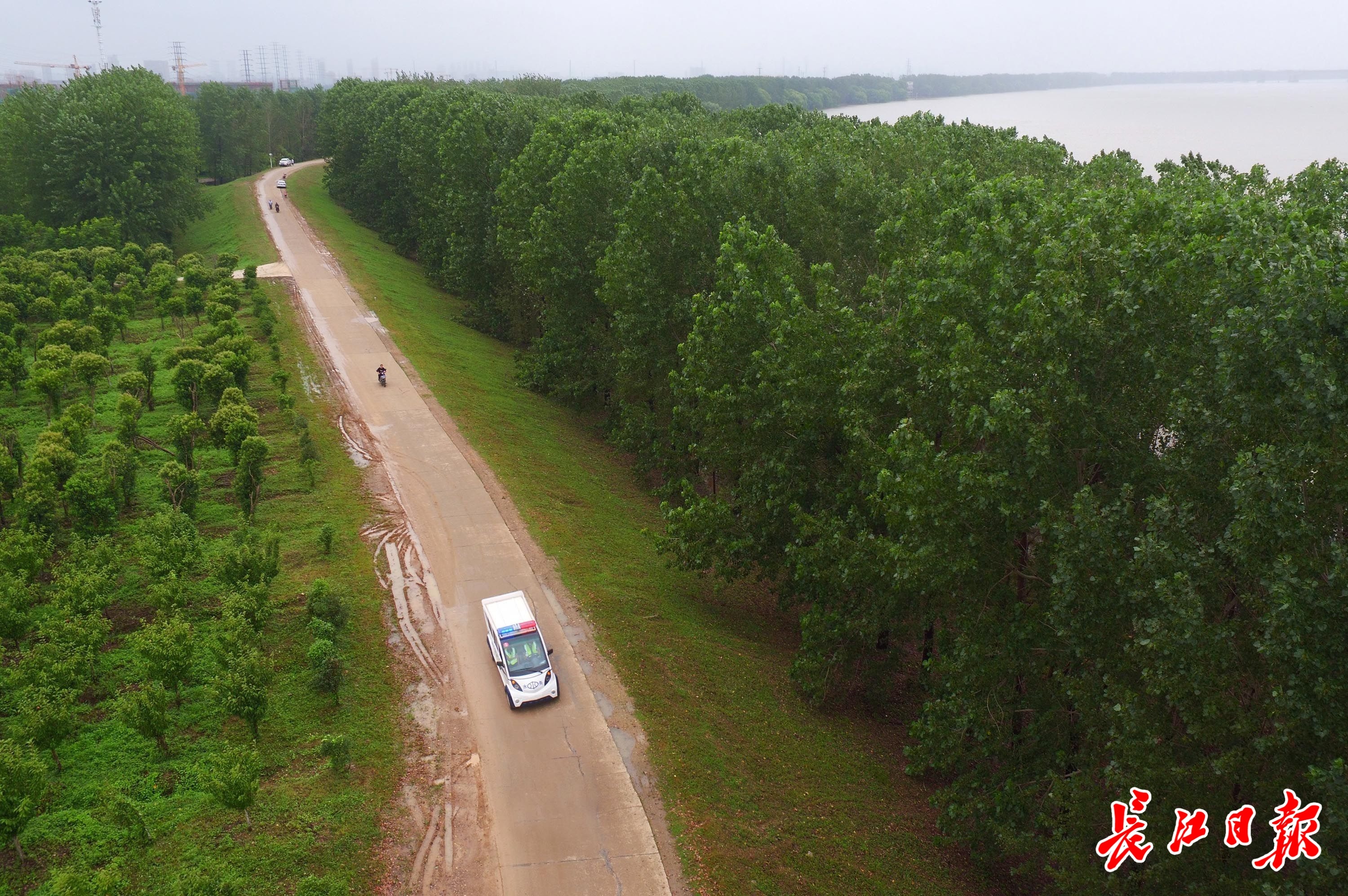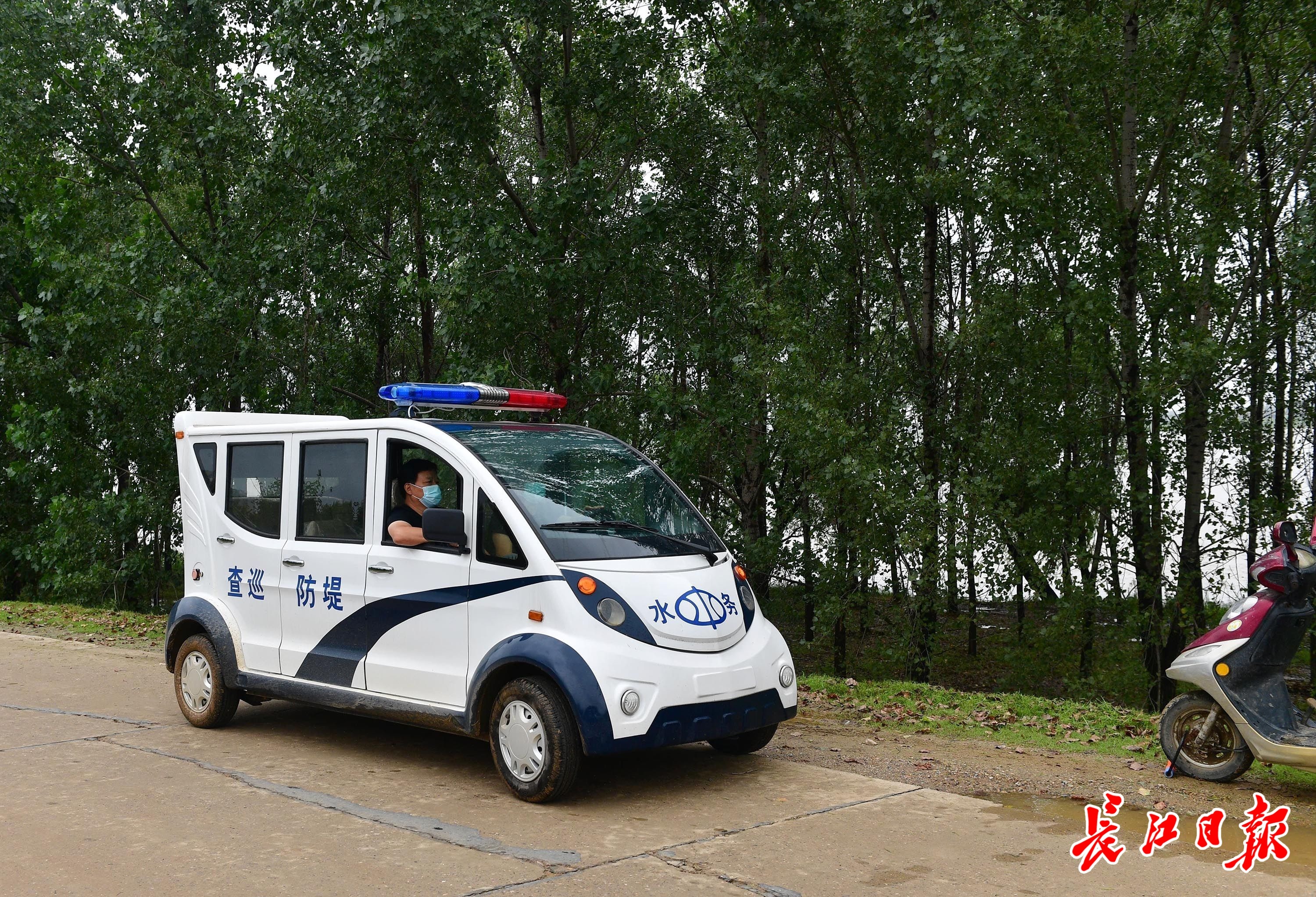 府河东西湖大堤,防汛工作车来回巡查,劝阻钓鱼人员。