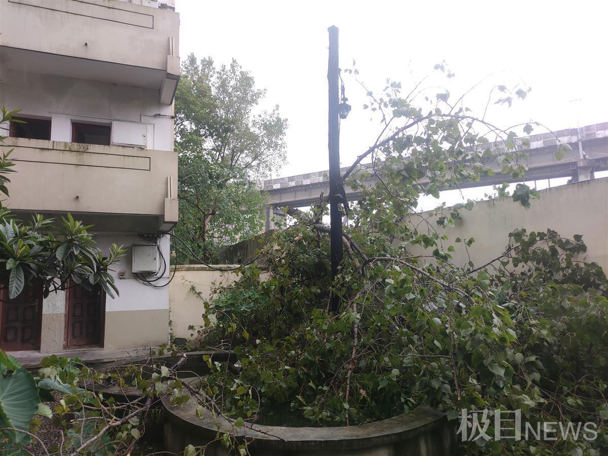 14日上午9时许,极目新闻记者来到现场,在该宿舍大院内,记者看到,倒伏在围墙上的树干已被锯成两截,部分树干和树枝压在景观灯杆以及下面的景观鱼池上。