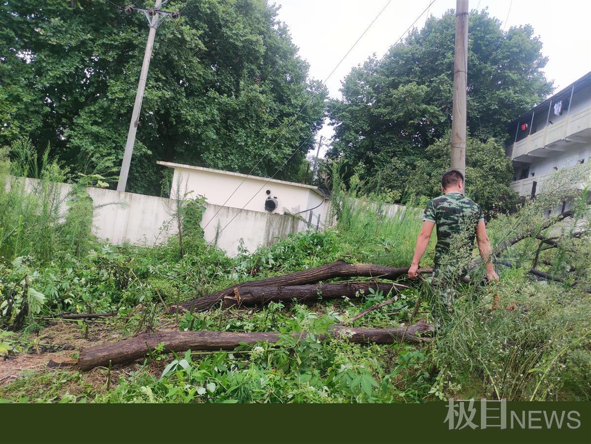 经过查看,他发现景观灯和鱼池已被砸坏,高压线被砸落掉在了地上并未断电。为避免掉落的高压线再次遭到树干砸伤,在确保安全的前提下,他和同事将高压线挑起,暂时固定到了墙上。