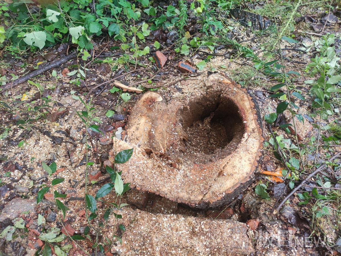 一名工人告诉记者,他们是该基地工作人员。13日上午接到通知后,来这里清理树木。“树的底部都被虫子蛀成了空心,本身存在隐患,加上这些天风大雨大,担心会出现险情,所以就派我们来进行清理。”记者看到,这棵直径大约70厘米的大树底部,60%以上的地方已被虫蛀成了空心状。