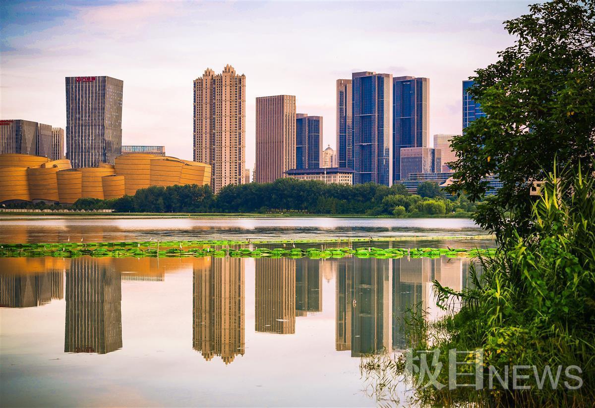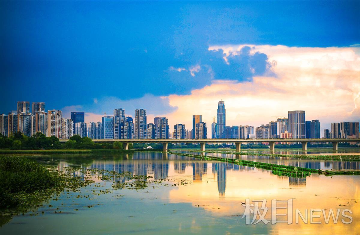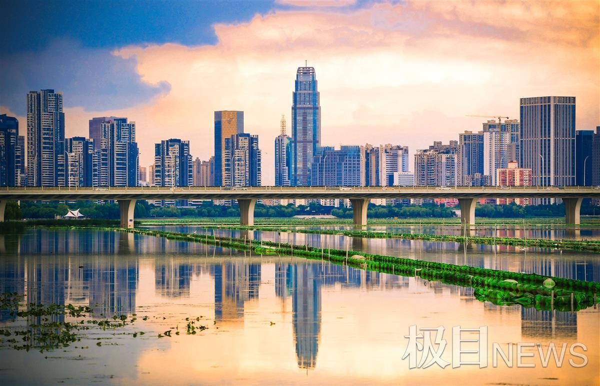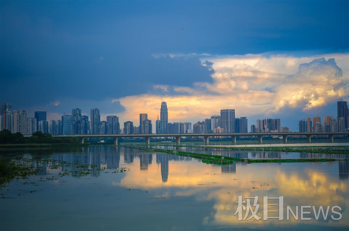 8月17日傍晚,连日雨天突然放晴,武昌沙湖的湖面平静,远远望云,城市的建筑、湖水和天空连接在一起,晚霞的余晖将湖面照耀成最美丽的风景,如诗如画,再现古诗中的美景秋水共长天一色。