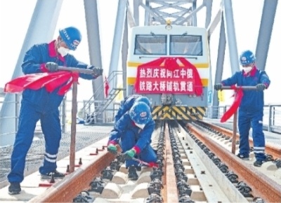 8月17日上午,在同江中俄黑龙江铁路大桥施工现场,中俄两国准轨接口最后一组轨道夹板安装完成,标志着中俄两国首座跨江铁路大桥——同江中俄黑龙江铁路大桥实现铺轨贯通。