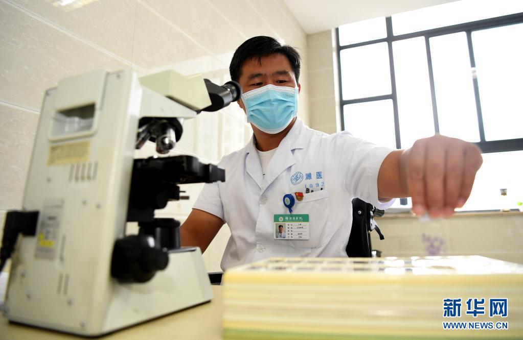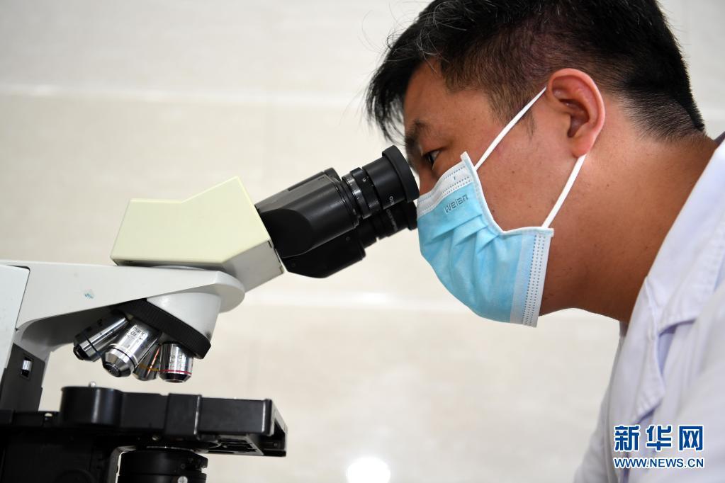 8月16日,王雷在濉溪县医院病理科观察病理切片。新华社记者刘军喜摄