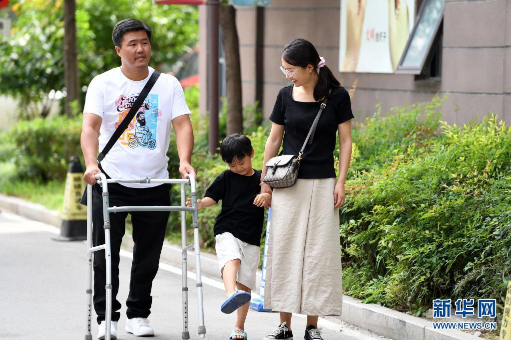 8月16日,王雷和家人在小区里散步。新华社记者刘军喜摄