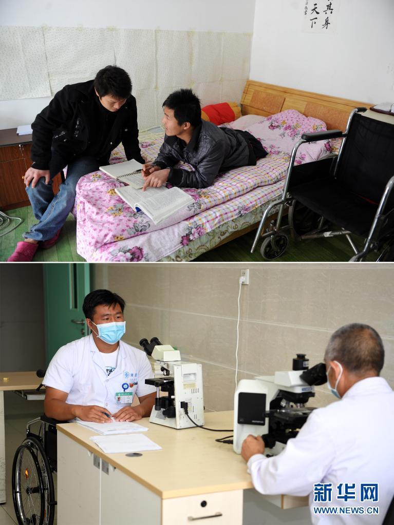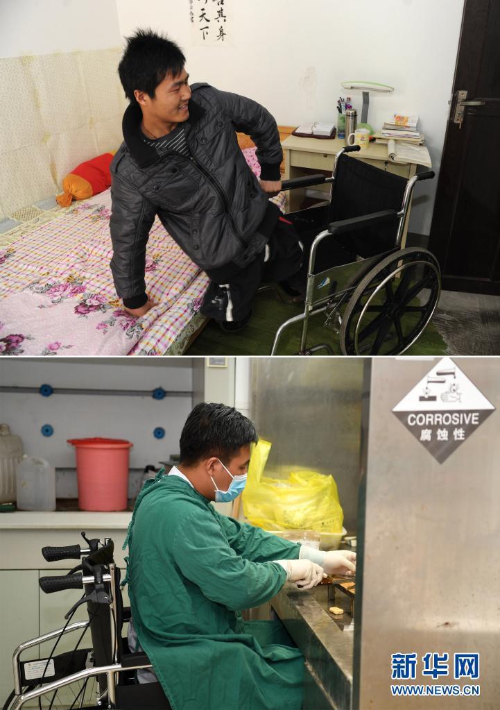 这是一张拼版照片,上图为:2011年3月5日,王雷从床上把身体移到轮椅上;下图为:2021年8月16日,王雷在濉溪县医院病理科进行切片操作。新华社记者刘军喜摄