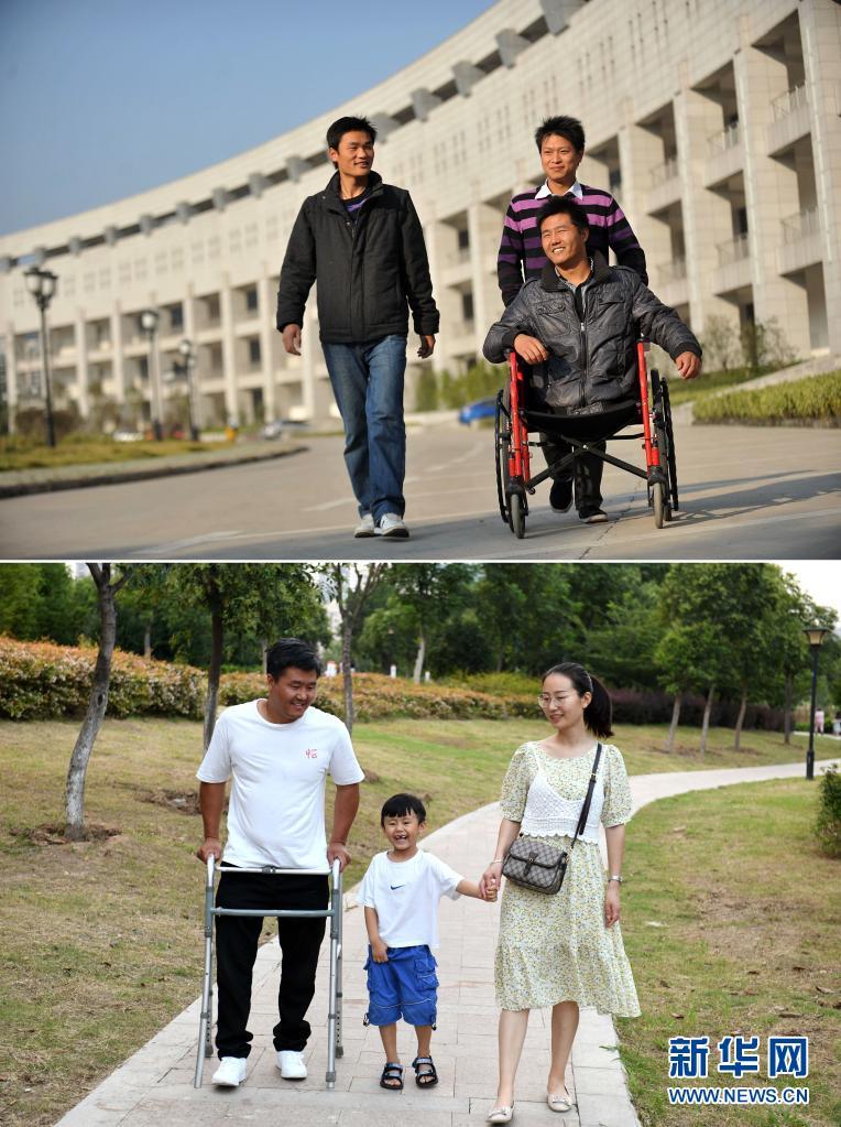 这是一张拼版照片,上图为:2011年10月31日,王雷在安徽医科大学校园里和同学在一起(新华社发 马杨摄);下图为:2021年8月15日,王雷和家人在濉溪县的一个公园里散步(新华社记者刘军喜摄)。新华社发