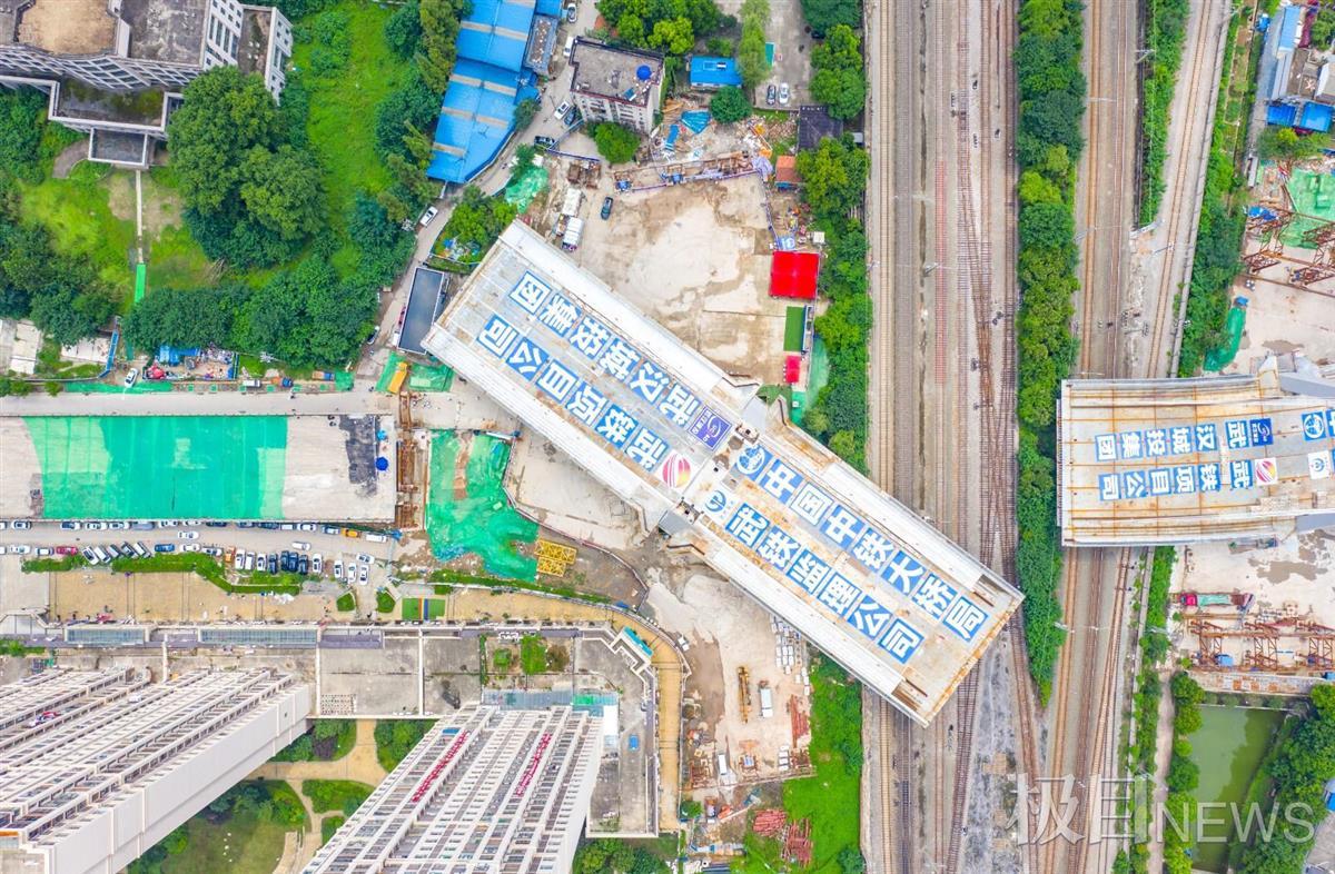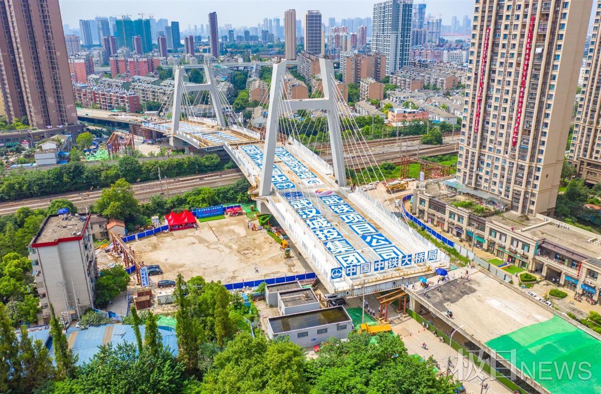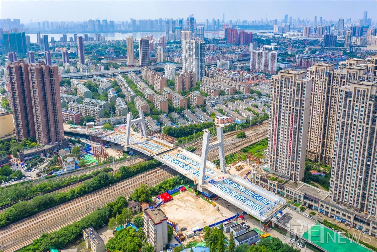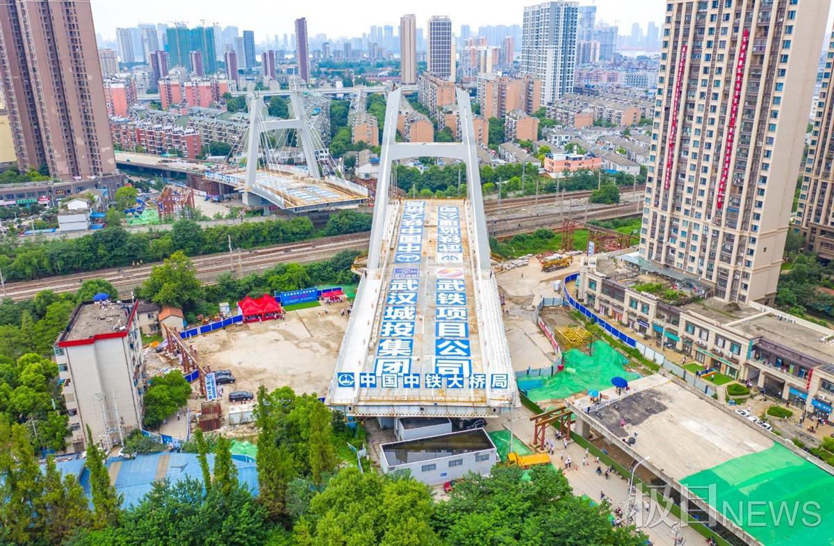 8月18日下午2时,经过70分钟的“静音”旋转,在位于武汉市建安街的上跨铁路桥工程施工现场,长133米、重1.4万吨的东主塔墩梁体水平转体83度,成功与西主塔墩箱梁在武余联络线与到发线6道之间的空地上方“牵手”,为跨京广铁路立交工程全面贯通奠定了坚实的基础。