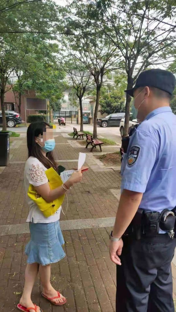 民警意识到,牟女士可能已经深陷骗局,必须尽快见面。可是当民警到达牟女士家里时,她不在家中,家人称其20分钟前边打电话,边下了楼。得知牟女士穿着拖鞋下楼,民警判断不会走远,发动其家人一起寻找。约15分钟后,终于在小区内一个长椅处,发现了仍在打电话的牟女士。