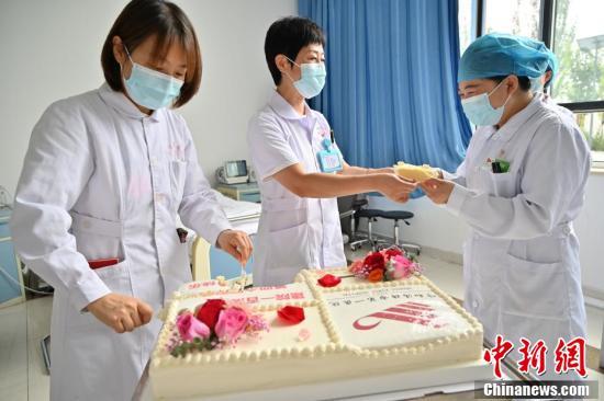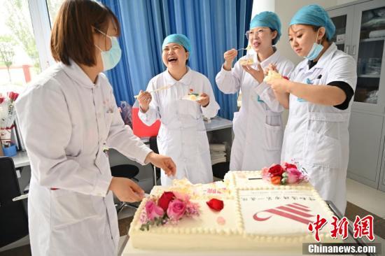 8月19日是第四个中国医师节,在呼和浩特市一所医院内,医院特地为医生护士定制蛋糕庆祝医师节,医护人员们在休息间隙品尝蛋糕,欢度医师节。 中新社记者 刘文华 摄