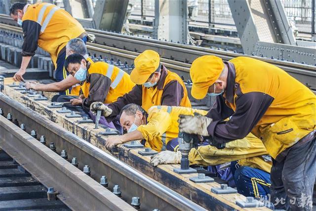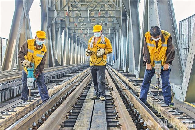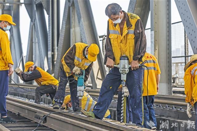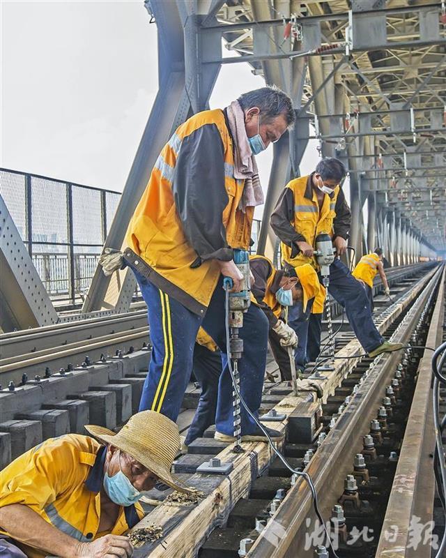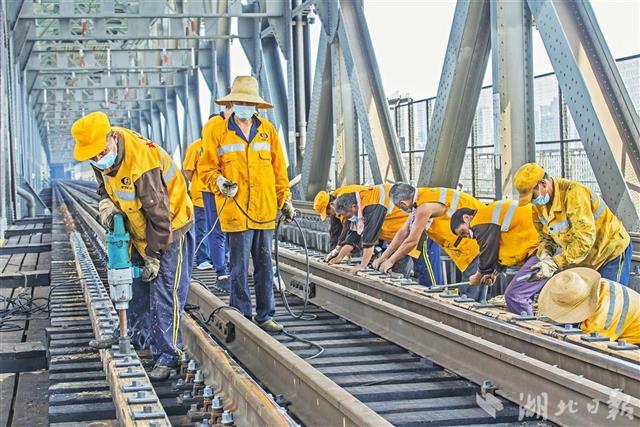 武汉长江大桥联通京广线大动脉,为保证铁路线安全,这些大桥上的专职“保姆”正进行桥梁大维修。他们在加强疫情防控措施的同时,严格执行施工流程,做好防暑降温等工作。从6月1日开始,桥梁工们按照大修计划,利用京广线“天窗点”,给大桥“强身健体”,延长桥梁使用寿命。目前,武汉桥工段已完成本次长江大桥大修任务的90%,本月底前将全部完工。(湖北日报全媒记者 梅涛 通讯员 陈强 摄)