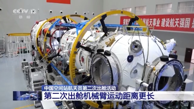 航天科技集团五院空间站机械臂操控及维修技术负责人 朱超:在第一次(出舱任务)经验的基础上,把这个指令之间(间隔时间)压缩了,所以说它运动起来可能更快,然后在这个路径过程中,我们在地面经过第一次的经验,规划完之后会进行干涉检查的计算,所以说运动保证路径也是比较安全的。