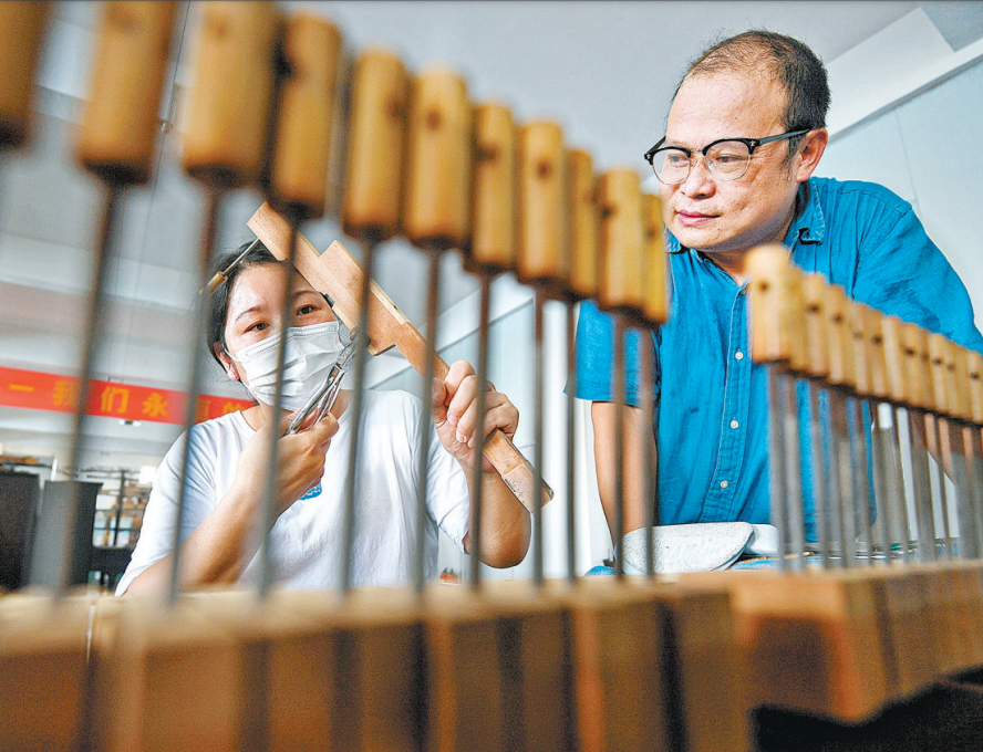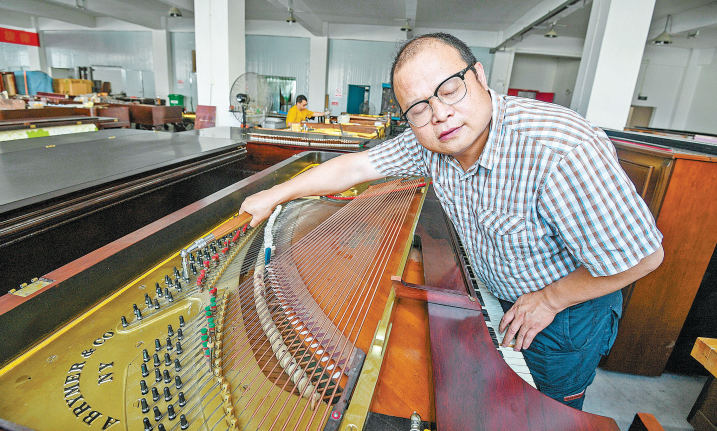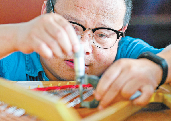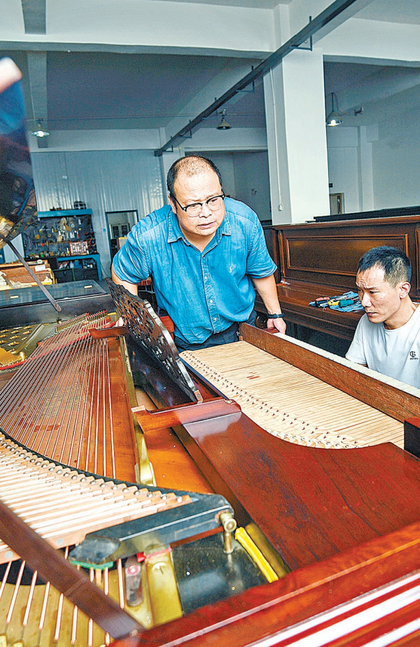 贺立军和修复师一起对修复的古董钢琴进行整体装配。