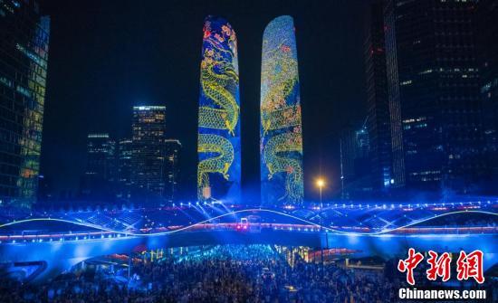 8月20日,四川成都,天府双塔、交子之环灯光秀现场。当日,2021年成都“三新”生活节启动暨交子大道开街仪式在蓉举行。 中新社记者 刘忠俊 摄