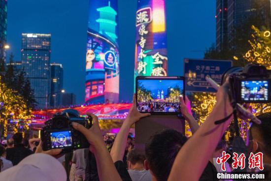 8月20日,四川成都,灯光秀吸引民众拍摄。当日,2021年成都“三新”生活节启动暨交子大道开街仪式在蓉举行,天府双塔、交子之环灯光秀吸引市民前往观赏和拍照。 中新社记者 刘忠俊 摄