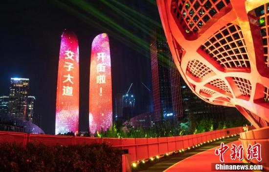 8月20日,2021年成都“三新”生活节启动暨交子大道开街仪式在四川成都举行,天府双塔、交子之环开启灯光秀。 中新社记者 刘忠俊 摄