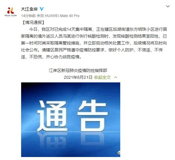 湖北日报讯(记者王成龙)8月21日,江岸区新冠肺炎疫情防控指挥部发布情况通报称,当日该区对已完成14天集中隔离、正在辖区后湖街道东方明珠小区进行居家隔离的境外返汉人员冯某进行例行核酸检测时,发现核酸检测结果呈阳性,已第一时间对其采取隔离管控措施,并立即启动相关处置工作,后续情况将及时向社会公布。