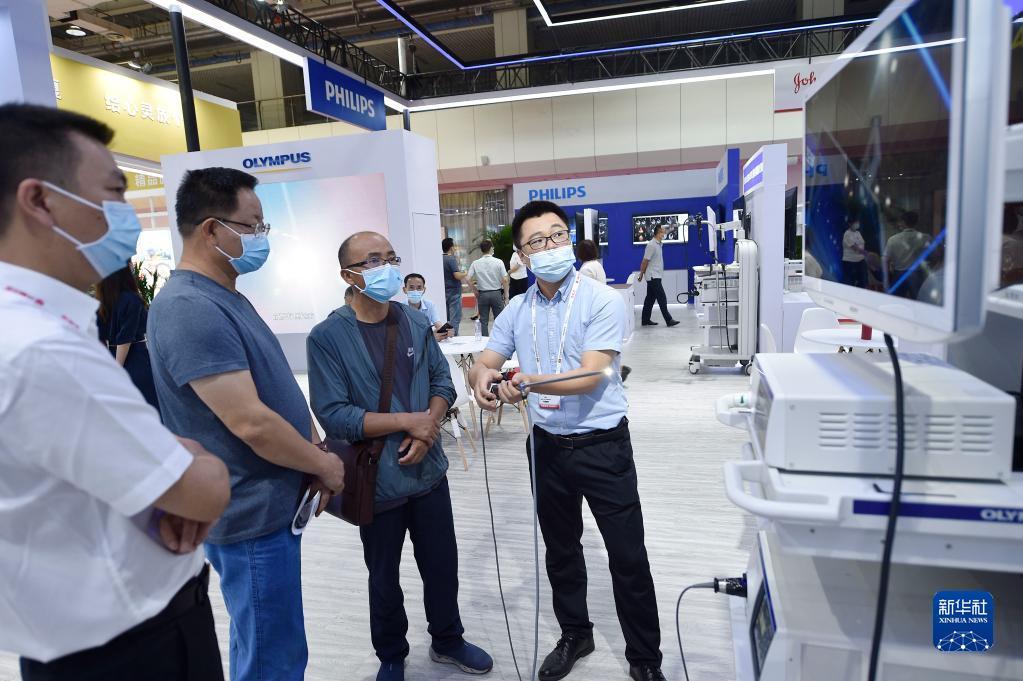 8月21日,参展商(右一)在中阿博览会医疗康养展区向参观者介绍内窥镜设备。